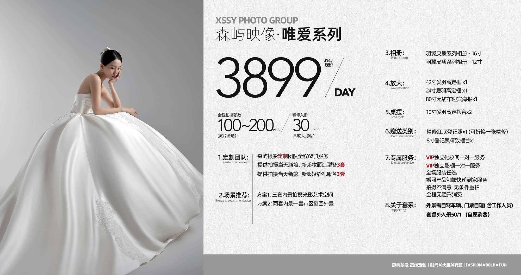1.拍摄时请保持愉快的心情 2.建议不要携带过多的贵重物品,以免丢失。 3.头一天晚上避免饮用过多的水,以防眼睛浮肿 4.建议女生前一天洗头,但不要使用护发素,睡前一定记得吹干 5.如有要求,可以随时沟通。原则上只要我们可以做到都会满足。 6.当天支付拍摄尾款 7.我们擅长捕捉爱的瞬间,我们认为最美的样子就是您开怀大笑的样子。感谢您的选择,我们会尽心尽责,不留遗憾。 8.愿拍摄合作开心,留下一次美好的记忆。
